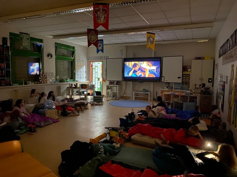 Zur Lesenacht mit dem Thema „Schule der magischen Tiere“ traf sich die Klasse 3b mit ihren Lehrerinnen an einem Donnerstagabend in der Schule. Nachdem jeder einen Schlafplatz im Klassensaal gefunden hatte, konnte die Lesenacht losgehen. Zuerst durften es sich die Kinder der 3b in ihren Schlafsäcken gemütlich machen und den Klassenkameraden ihr Lieblingsbuch vorstellen, welches dann bei einem Bücherstand ausgestellt wurde. Danach gestalteten die Kinder ihre eigenen magischen Tiere. Zauberhafte Tierrätsel, Puzzle und magische Spiele wurden in Kleingruppen bearbeitet. Ebenso wurde im Buch „Die Schule der magischen Tiere Band 1“ von der Klassenlehrerin vorgelesen. Auch lustige Witze aus dem „Schule der magischen Tiere Witzebuch“ und dem Schmökern am Bücherstand durfte nicht fehlen. Am späten Abend kuschelten sich alle in ihre Schlafsäcke und schauten zum Einschlaf den Film zum Thema. Am frühen Morgen wurden alle 3.Klässler mit fröhlicher Morgenmusik geweckt. Nach einem kleinen Frühstück wurde aufgeräumt und die Lesenacht endete. Alle Kinder waren sich einige: So könnte die Schule (der magischen Tiere) immer sein!